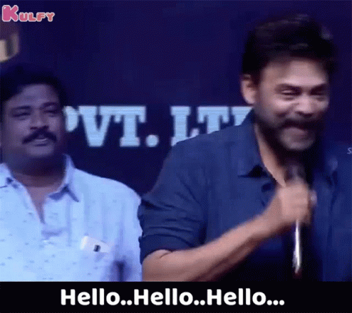 Venkatesh Daggubati greets the audience with an energetic 'Hello' at the Venky Mama Blockbuster Event.