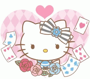 Hello Kitty winks, adorned with a striped bow and blue flower, surrounded by playing cards and roses.