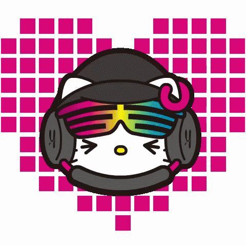 Hello Kitty wears rainbow disco sunglasses and headphones, with hearts in her eyes, against a pixelated heart background.