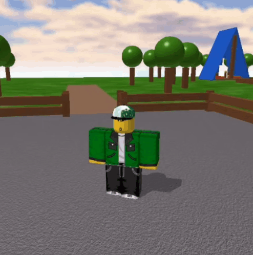 Roblox character Rochas313 in a green jacket and white hat greets with 'hello!!!' in a virtual world.