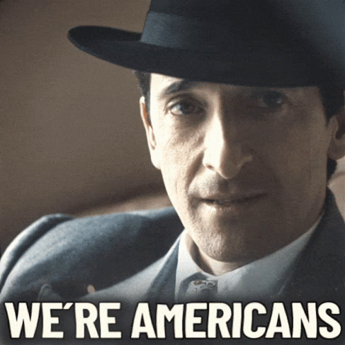 Adrien Brody as Luca Changretta from Peaky Blinders, wearing a hat and suit, states 'We're Americans'.