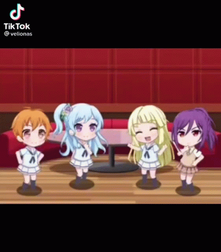 Hellohappyworld Harohapi chibi girls express happiness with 'Happy!', 'Lucky!', 'Smile!', and 'Yay~!' in a lounge.