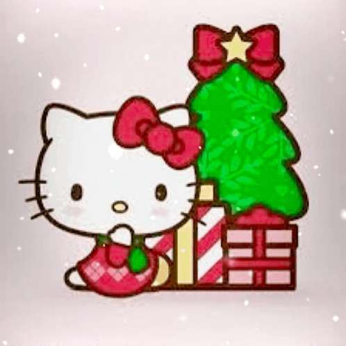 Hello Kitty sits beside a festive Christmas tree and a stack of presents, as gentle snow falls around her.