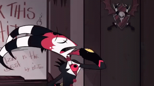 Blitzo from Helluva Boss reacts to a whiteboard message, changing from surprise to a sinister smile.