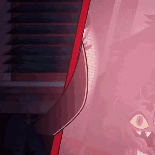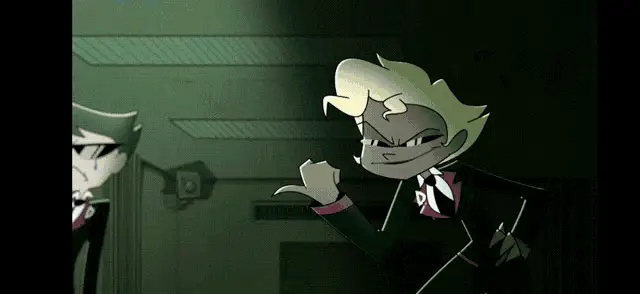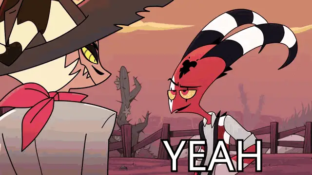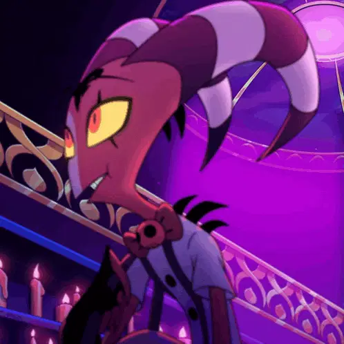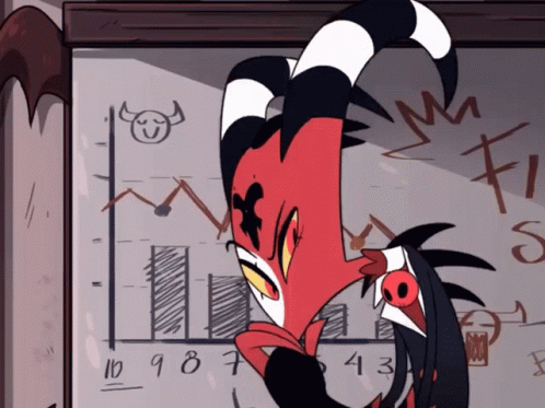 Blitzø from Helluva Boss reacts happily in front of a graph, eyes sparkling with excitement.