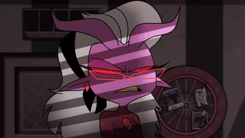 Mrs. Mayberry from Helluva Boss, a horned character with glasses, stares angrily with glowing red eyes.