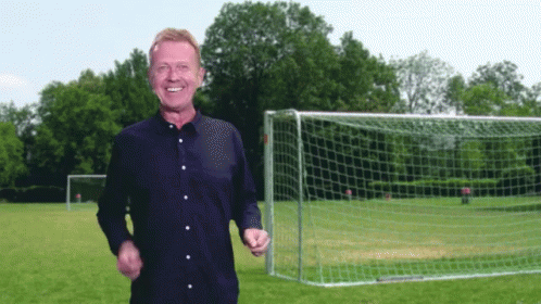 Thomas Helmer celebrates joyfully on a soccer field in front of a goal, associated with RTL.