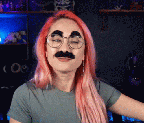 Hendo Hendoart playfully poses with a fake mustache and eyebrows, showcasing her pink hair.