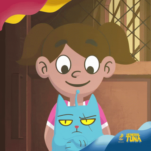 An animated girl lovingly hugs Heneral Tuna, a grumpy blue cat, in a scene from the Heneral Tuna series.