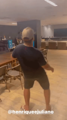 Juliano, from the duo Henrique e Juliano, shows off his dance moves in a lively indoor setting.