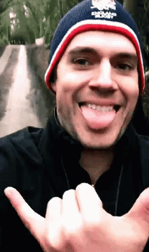 Henry Cavill playfully sticks out his tongue and makes a shaka sign while wearing a beanie outdoors.