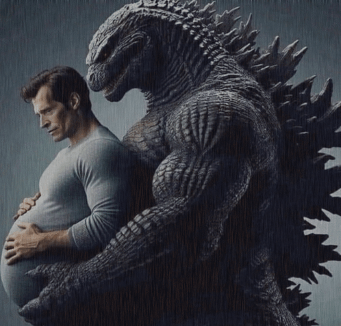 Henry Cavill with a pregnant belly, embraced by Godzilla, referencing Willem Dafoe and superhero themes.