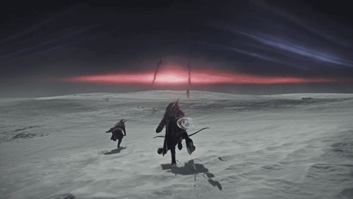 a person riding a horse in a snowy field with a sunset in the background