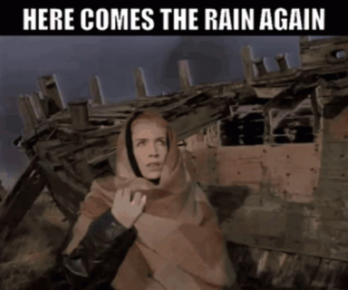 Annie Lennox from Eurythmics' 'Here Comes The Rain Again' music video, standing in a desolate, stormy setting.
