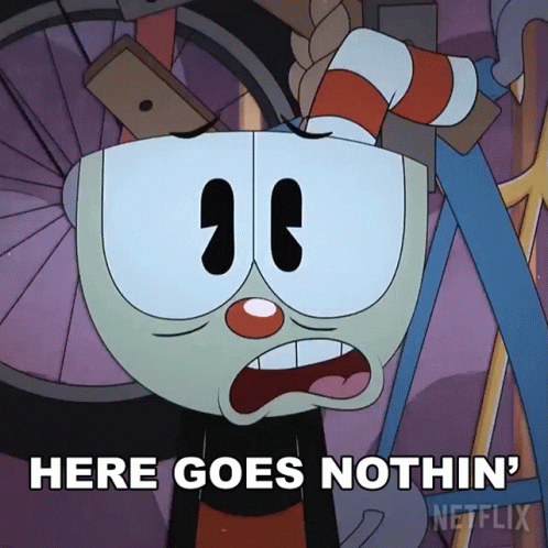 Cuphead from The Cuphead Show utters 'Here Goes Nothin'' with a determined expression.