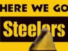 A hand points to a yellow and black sign displaying 'Here We Go Steelers' for the football team.