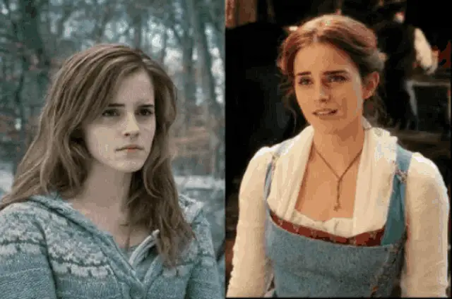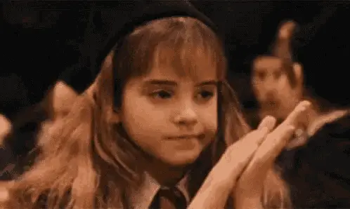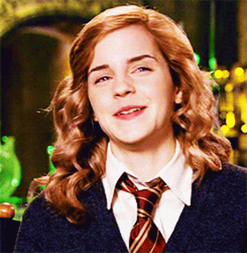 Hermione Granger smiles sweetly, wearing her Hogwarts uniform and Gryffindor tie, in a close-up shot.