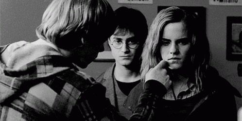 Hermione Granger, Harry Potter, and Ron Weasley in a serious moment.