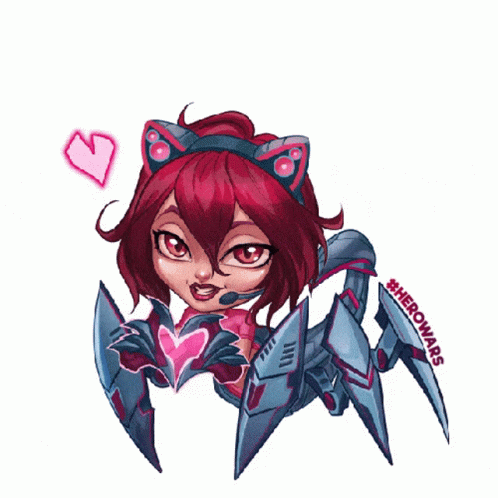 Hero Wars character Ziri, the cyber scorpion girl, surrounded by floating hearts, showing love.