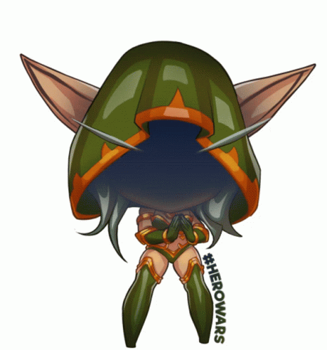 Chibi elf character from Hero Wars reveals an evil grin and glowing eyes, with a fiery red background.