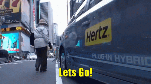 A woman walks past a Hertz Plug-in Hybrid car on a busy city street with billboards, as the text 'Lets Go!' appears.