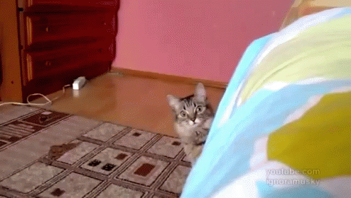 A curious tabby cat with wide, expressive eyes peeks out from behind a light blue and yellow blanket.