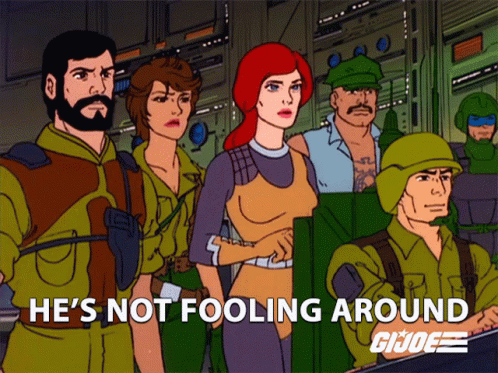 G.I. Joe characters Scarlett, Lady Jaye, and Gungho look on seriously as the caption states, "He's not fooling around."