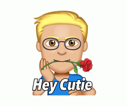 An emoji-style character with glasses holds a rose in its mouth, winking with the caption 'Hey Cutie'.