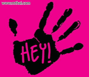 A bold black handprint with the word 'HEY!' in light blue, set against a vibrant cyan background.