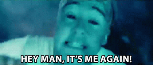Jake Roche from pushbaby, with a stylized blue face, exclaims 'HEY MAN, IT'S ME AGAIN!'