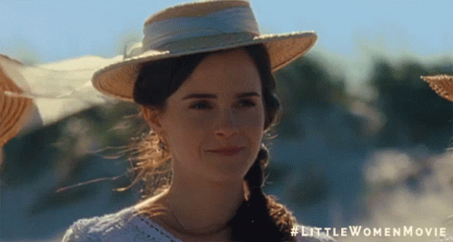 Emma Watson as Meg March and Saoirse Ronan as Jo March from Little Women share a subtle smile on the beach.