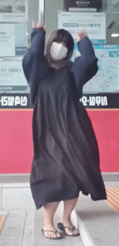 Korean streamer Heybbibbi (Bbibbi) performs a public dance in a black dress and mask, possibly a Caramelldansen.