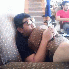 A man wearing sunglasses lies on a couch, then looks up in a classic "Deal With It" meme style.