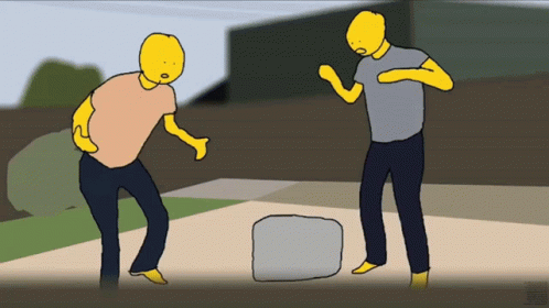 Two yellow cartoon figures, possibly Hfjone Cheesy Hfj, are shown dancing with exaggerated movements.