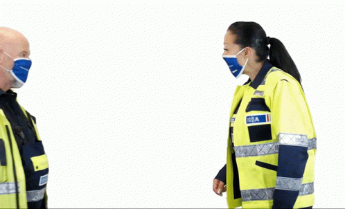 Two HHLA employees, a man and a woman, wearing safety vests and face masks, perform an elbow bump.