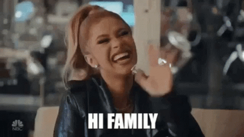 Card B laughs and waves, greeting her family with a cheerful 'Hi Family' message displayed on screen.