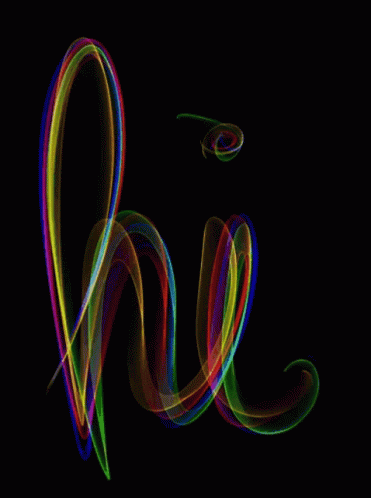 The word "hi" is beautifully written in flowing, rainbow-colored light trails against a dark background.