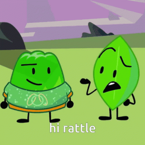 Two green cartoon characters, one jelly-like and one leaf-shaped, interact as "hi rattle" appears.