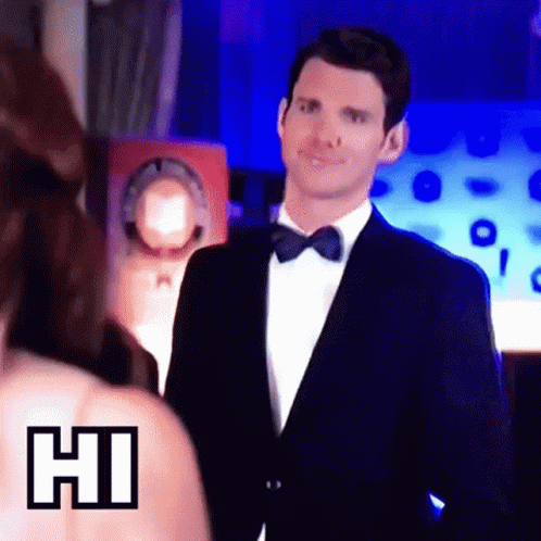Kevin McGarry, dressed in a sharp tuxedo and blue bow tie, smiles as the word 'HI' appears on screen.