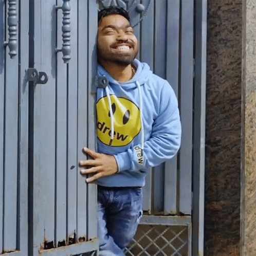 Vibhu Varshney, wearing a Drew House hoodie, smiles and waves hello while peeking from behind a metal gate.