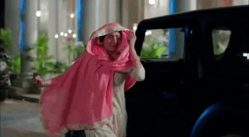 Hiba Nawab runs and hides her face with a pink scarf near a car, possibly from a Star Plus show.