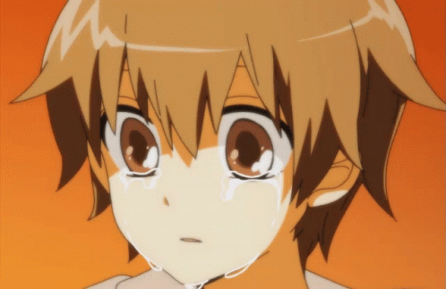 Hibiya Amamiya from Kagerou Daze cries with tears streaming down his face against an orange background.