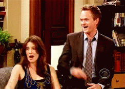 Neil Patrick Harris as Barney Stinson high-fives Robin Scherbatsky from How I Met Your Mother.