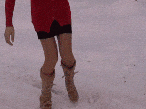 Woman carefully walks on ice and snow wearing high-heeled boots and a red sweater.