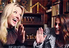 Kristen Stewart and another woman share a happy high-five and laugh in a cozy indoor setting.