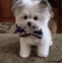 An adorable fluffy white puppy wearing a blue bow tie gives a cute high-five with a human hand.