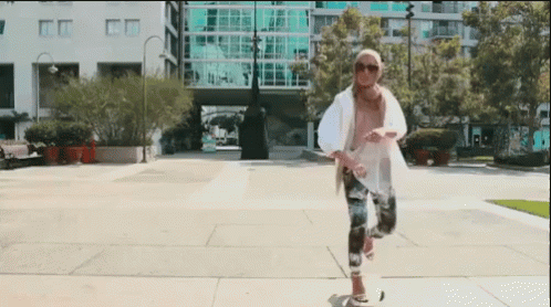 Hijaber stylish menunjukkan keahliannya naik skateboard di kota dengan gaya modis dan percaya diri.