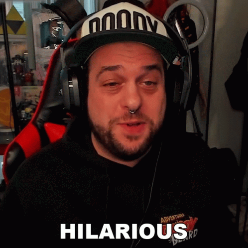 A man wearing a 'DOODY' hat and headphones smiles, with the word 'HILARIOUS' displayed on screen.