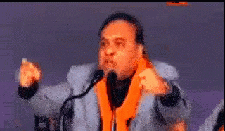 Himanta Biswa Sarmah, an Indian politician, passionately speaking into a microphone with arms raised.