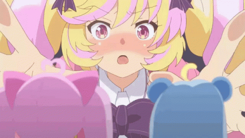 Himeko Mashima from Show By Rock!! with a shocked expression, hands raised, and two plush toys.